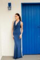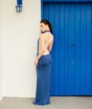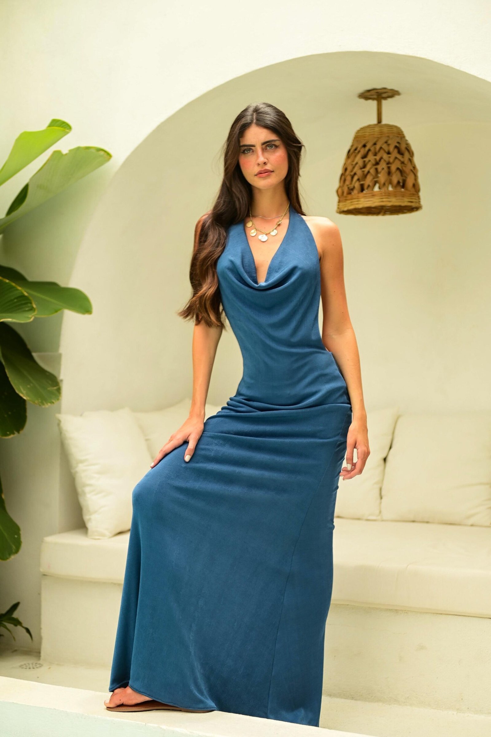 O modelo frente única destaca o colo com um belo decote drapeado, enquanto as laterais abertas e o decote profundo nas costas trazem leveza e modernidade ao visual. Com caimento alongado e tecido suave, ele acompanha o corpo com naturalidade e realça a silhueta de forma elegante. No tom azul sofisticado, é a escolha perfeita para eventos ao ar livre, festas e ocasiões que pedem um look marcante e refinado.