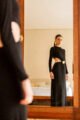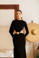 Com elegância marcante e apelo sofisticado, o vestido Priscila traduz uma estética contemporânea com toque de sensualidade refinada. A modelagem de mangas longas e decote fechado cria um contraste elegante com os recortes laterais na cintura, que revelam a pele de forma estratégica e valorizam a silhueta feminina. O detalhe central em metal dourado funciona como ponto focal da peça, conferindo sofisticação e um acabamento joia que eleva o design minimalista.