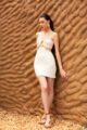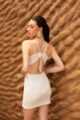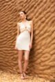 Este vestido nasce do encontro entre delicadeza e personalidade. A construção em duas partes cria a ilusão de top e saia unidos por detalhes centrais em pedra, que funcionam como ponto de conexão e assinatura visual da peça. O decote suave, sustentado por alças finas, revela a pele com naturalidade e equilíbrio, reforçando uma estética feminina, leve e sofisticada.